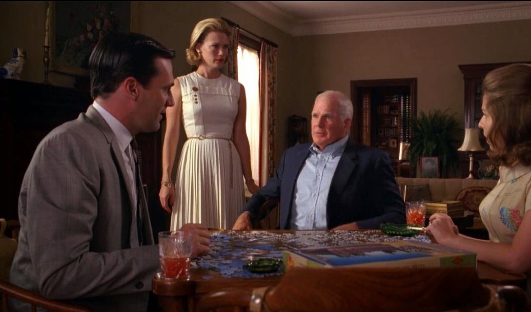 Every scene with the Hofstadts is strange, with an easily detectable tense undercurrent between everyone. It’s a family on paper, but there’s no discernible warmth to speak of; Betty is excluded from things here, just as she’s excluded from her own life by Don. Maybe her father Gene — apparently a strict, traditional guy.. fining his kids for small talk — is what she wishes Don would be like around their kids. (Y i k e s….)