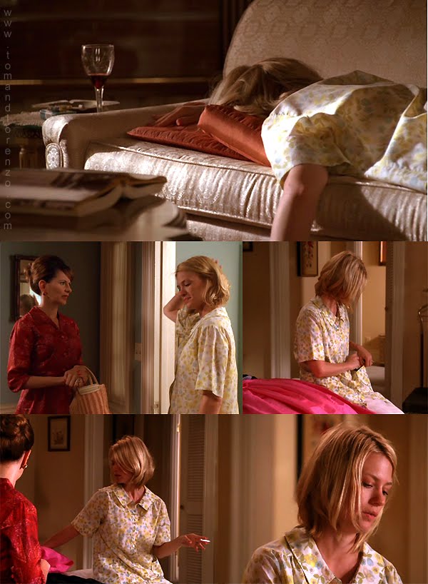 Betty is taking care of some house shit in an attempt to feel normal. Time to put new contact paper in the drawers, defrost the icebox, attempt to open your bastard husband’s locked desk drawer with a letter opener.. then pass out, face down in the lounge with a glass of red. Just then, Sara Beth swings by to borrow a dress; Betty claims she’s sick. SB is crushing on Arthur, and Betty raises an eyebrow.