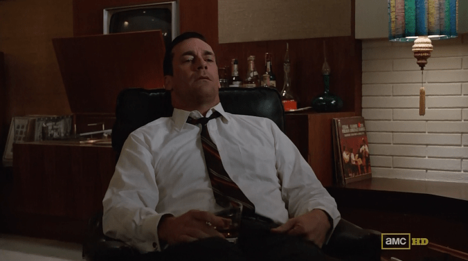 Joan gets served with divorce papers via Shit Husband (and person) Greg, and after launching an airplane model at poor Meredith, she’s more than ready to engage in some Jaguar roleplay with Don. Natch, they end up at a bar. Don and Joan are both survivors of failed marriages, wondering whether tomorrow will be better than yesterday.
