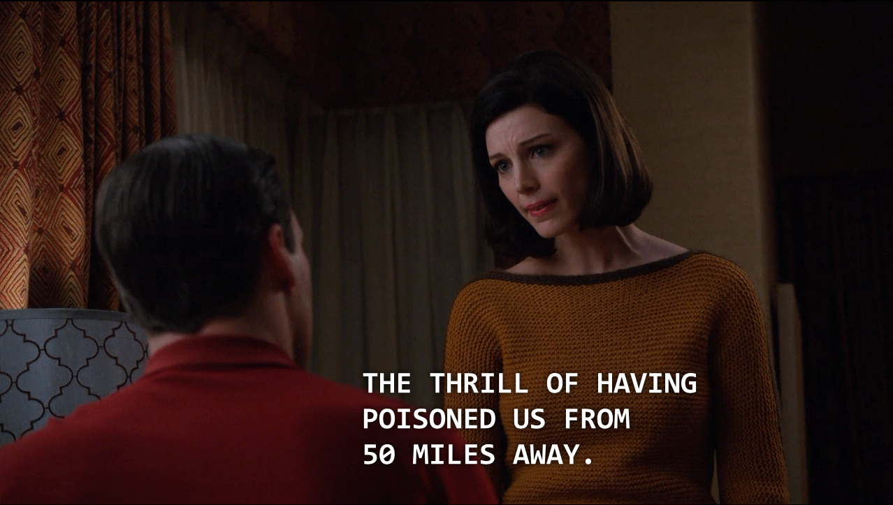 Let’s move on to Lane and his shady shit. Looks like he’s in a giant money hole with the UK government, owing a whole pile of taxes on his portfolio with no way to pay. Pride is one hell of a drug; he further’s SCDP’s line of credit at the bank semi-fraudulently, claiming that the numbers for 1967 were commitments instead of just projections. He spins it to the other partners as a ~cash overflow~, so his now-possible Christmas Bonus could cover what he owes. The other partners put the kibosh on their bonuses, opting to give them to the staff. It’s blinding how quickly his entire plan was fucked.