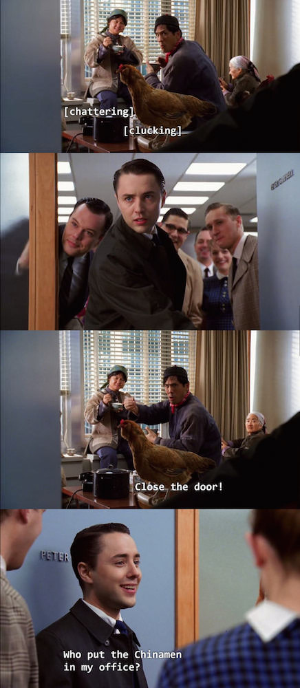 Everyone’s loaded on punch post-shower, heading home for the day, yet Pete lingers. He’s a little tweeked about flying to LA since his father died on American Airlines Flight 1, but that’s not really the root of his issue(s). He may never truly grasp why he doesn’t get what he feels entitled to, and on top of that, he may never understand how grim it is for everyone who doesn’t have what he has in the first place. Pete’s got some privilege, everyone. Peggy handles his “woe is me, first world problems of the now” drunken schpiele fairly perfectly. She is friendly and cordial, actively listening, but keeps him at arms’ length. Probably a good idea, Pegs.