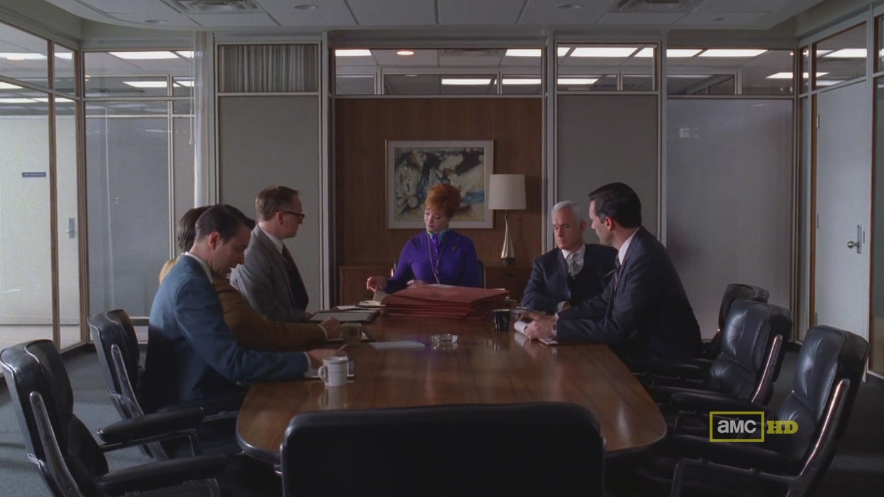 The true crown jewel of this episode is the partners meeting. That absurd hooker party blows up in Lane’s face in the form of CHEWING GUM [left] ON [Edwin’s] PUBIS, and he challenges Pete to a fucking fist fight in the conference room.. and proceeds to kick Pete’s ass.